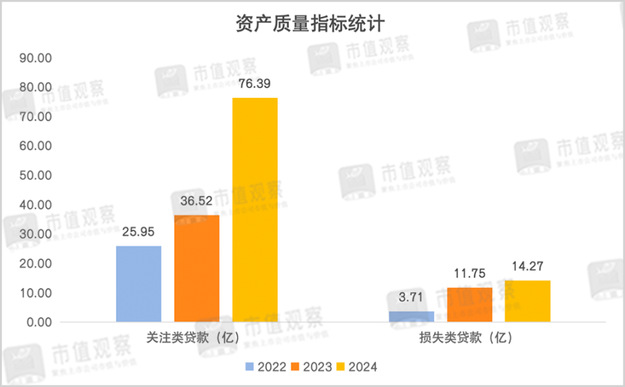 东莞银行损失类贷款的快速攀升也值得警惕,从2022年的3.71亿增长至2024年的14.27亿,2年间增幅达284.64%。