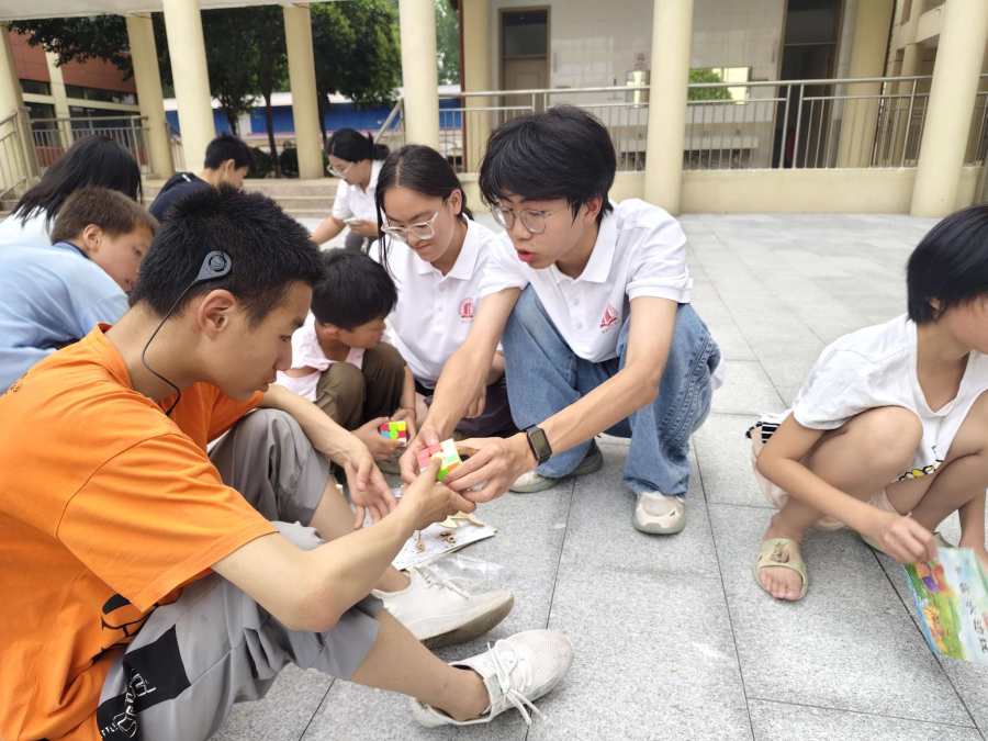 魔方的教学中,志愿者讲解着基本玩法,孩子们听得格外认真。有个孩子很快就掌握了技巧,还反过来教其他同学,志愿者在一旁看着,心中满是欣慰。孩子在教会别人的过程中增强了自信,志愿者也从孩子的聪慧中看到了无限可能。
