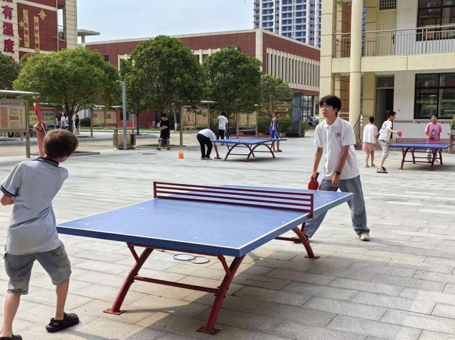图为志愿者与学生们在乒乓球台上比拼球艺。 柴灏明 供图
