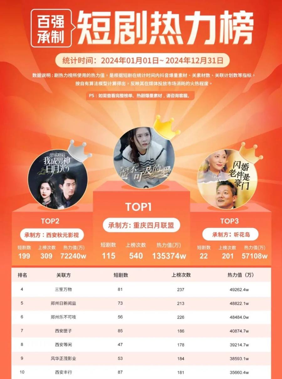 整体上看,从内容转型的风口驱动,到短剧井喷延伸出走量打法,再到内容提质助力更多公司成长,各个发展路径上都已经“卷”出头部势力。短剧发展行至眼下,创作市场的竞争格局也开始逐渐清晰起来。