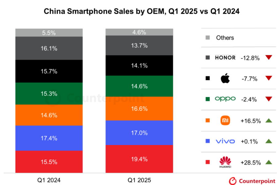 2025年第一季度,这个排名变成了华为、vivo、小米、OPPO、苹果、荣耀,市场份额分别为19.4%、17.0%、16.6%、14.6%、14.1%和13.7%。如果单从份额数据来看,只有华为、vivo和OPPO抢到了更多的份额。