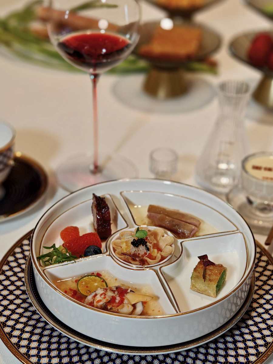 前菜 | 姜蓉桶子鸡、脆皮豫南黑猪肉、帕马火腿捞雪蟹肉、酸柑汁花甲王、翡翠腐皮卷