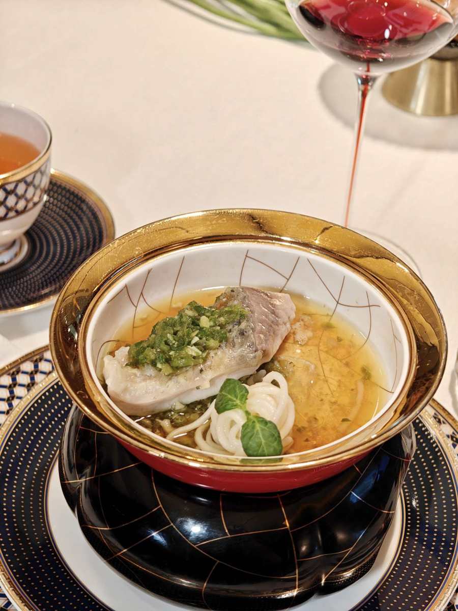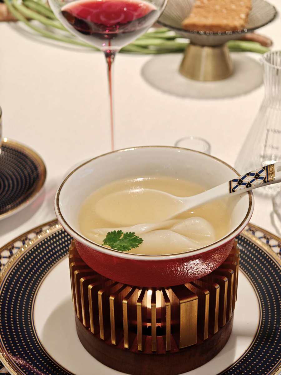这场宴席的主题是固始鸡,头汤也是固始鸡7个小时吊出来的汤底。用上应时应季(只有这几天)的鲜松茸,炖一盅软糯花胶——该隐忍的隐忍,该出彩的出彩,相得益彰。