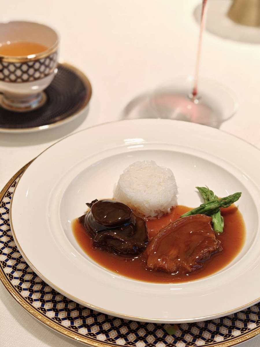 厚而醇的干鲍发制再烹饪,是整餐唯一需要用刀切成小块慢慢品的菜肴。烧干鲍有软心溏,入口柔而韧,时间沉淀的风味是藏不住的鲜甜。焖罐肉是信阳菜的代表,“上半年炒茶,下半年炒焖罐肉”,信阳土猪先腌后炒再焖得到的焖罐肉,不肥不腻不柴,焖罐肉烧干鲍,是地地道道,来自山海的相逢。