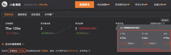 据第三方数据显示,小鱼海棠近30天直播带货销售额为75万-100万。而其广告报价为1-20秒视频预估报价25万元,21-60秒视频预估报价60万元,60秒以上视频预估报价70万元。