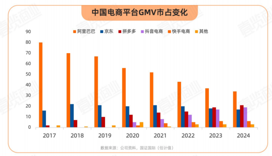 一方面,在电商新势力的冲击下,阿里巴巴核心电商业务市场份额显著降低,2024年与2017年相比市场份额减少了46%,市场占有率腰斩。淘天集团近三年营收年复合增长率仅为0.6%,