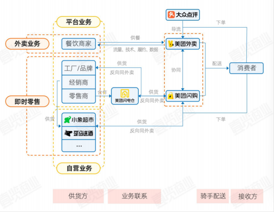 美团的“外卖+即时零售”模式中,商家端覆盖多类市场主体,包括餐饮商家、工厂/品牌方、经销商、零售商,以及美团自主运营的品牌。