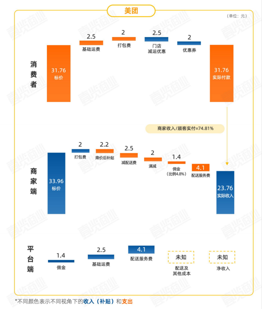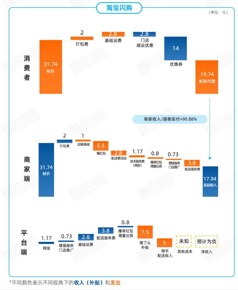 从商家端看,美团平台商家获得的实际收入最高,京东次之,淘宝闪购最低。但是商家端在京东平台获取的收入甚至超过了消费者所支付的价格,反映出京东对平台商家的支持;