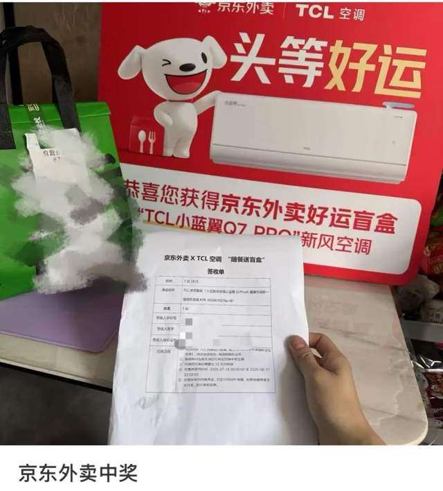 这波狂欢的引爆点是京东7月18日“超级外卖日”砸出的狠招,TCL、三元、兰蔻、敷尔佳等品牌下场参战,100万份好运盲盒直接撒向市场,下单外卖就有机会捞到空调这种“硬通货币”。