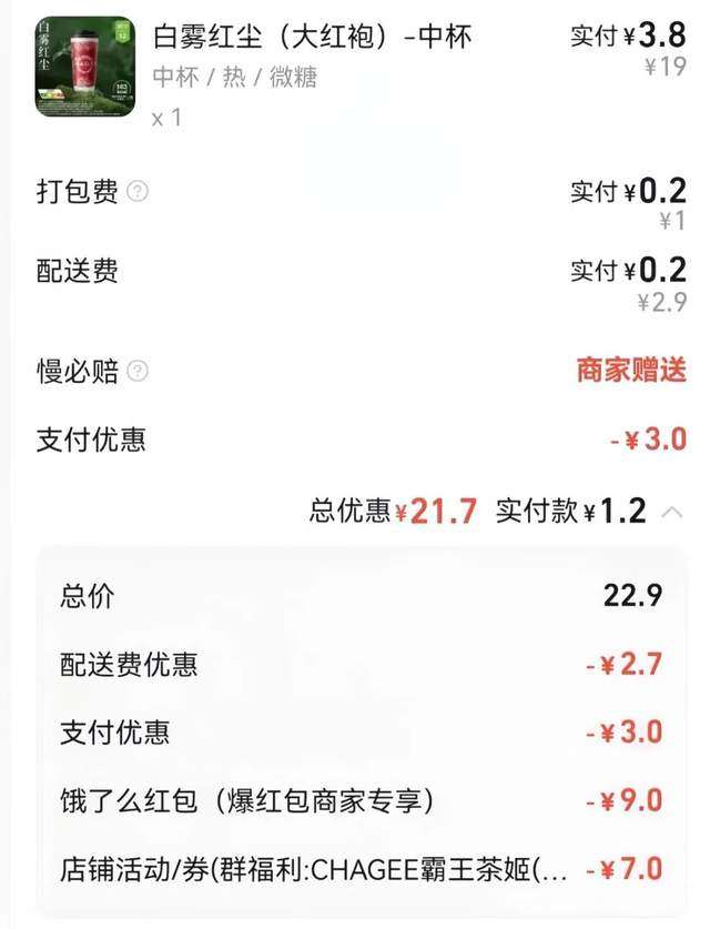 霸王茶姬的“个位数单价”几乎与蜜雪冰城的低价带重合,被网友调侃 “干成了平价茶饮”,有消费者晒出叠加“15-10”与“7-6”的券后,产品到手价仅1元的案例。