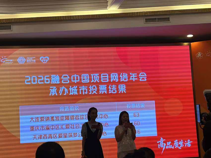 本次年会上,2026年融合中国项目网络年会承办城市投票结果显示,大连爱纳孤独症者综合服务中心以63票最高分赢得2026年年会承办权,预示融合中国2026年年会将在大连举办。
