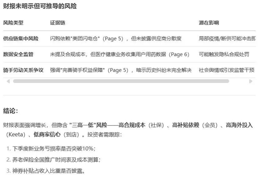 对于非财务关键信息,模型的聚焦点则略有不同,但大多集中于核心本地商业收入和利润的强劲增长、闪购和即时零售业务的快速发展、餐饮外卖业务的持续优化以及骑手权益保障体系的升级等方面。