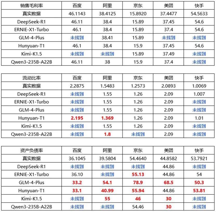 对于销售毛利率,尚有DeepSeek-R1、ERNIE-X1-Turbo和Hunyuan-T1能够获取五家公司的全部正确数据。