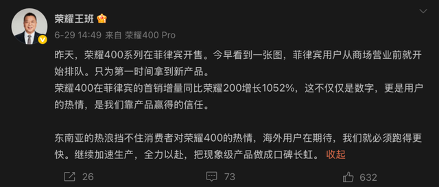 比如,6月29日,荣耀终端股份有限公司销售与服务总裁王班在社交平台发文称,荣耀400在菲律宾的首销增量同比荣耀200增长1052%。
