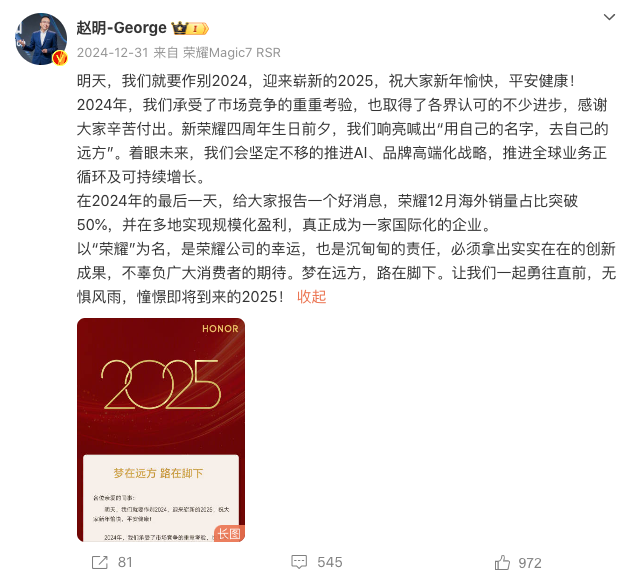 据了解,王元琳此前担任荣耀全球销服渠道部部长,为荣耀拓宽海外市场立下汗马功劳。赵明曾透露,2021年初,荣耀海外市场份额几乎为零。2024年末,赵明表示,“今年12月,荣耀的海外销量占比突破50%,并在多地实现规模化盈利,真正成为一家国际化的企业”,高度肯定王元琳取得的成绩。