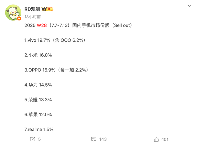 事实证明,高层变动,外加推出“务实”的产品,确实使荣耀回到了中国手机市场中心。RD观测披露的数据显示,2025年第24周(6.9-6.15)-28周(7.8-7.14),在中国手机市场,荣耀手机市占率从11.9%上涨1.4个百分点至13.3%,市场排名从第六上升至第五,重返TOP 5榜单。对比而言,2025年前五个月,荣耀的市占率仅为11.5%。
