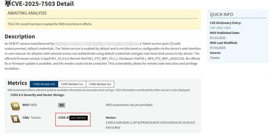 这么问的原因是因为,最近我们知危编辑部关注到一个新的 CVE ( 常见漏洞和暴露 )漏洞 ,影响的是某款还挺热门 IP 的摄像头,这个漏洞的威胁评级甚至达到了满分 10 分。
