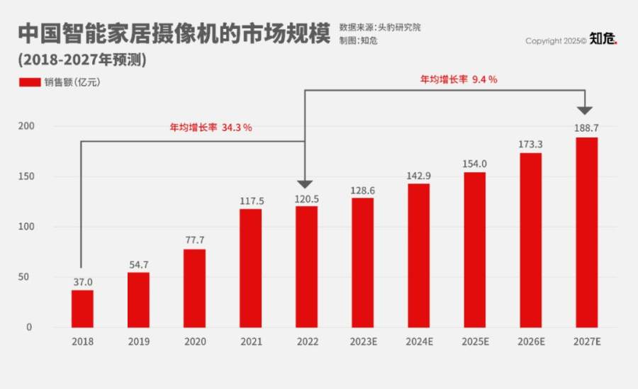 正因为这样庞大的需求,家用摄像头的市场规模这两年呈现出明显的上升趋势。根据相关机构的预测,到 2027 年,家用摄像头的市场销售额有望达到 188 亿元,五年间的年复合增长率接近 10% 。