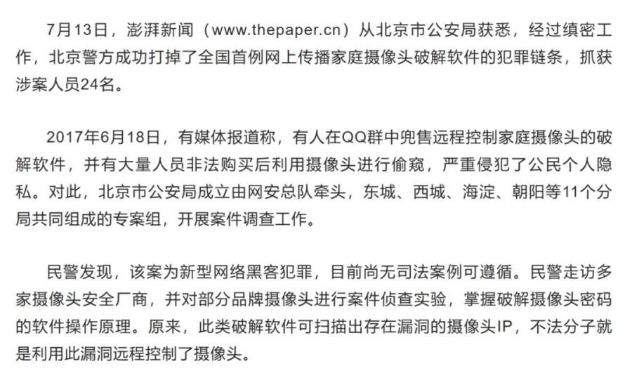 知危编辑部早年间也刷到过一些新闻,让人不禁倒吸一口凉气。比如 2017 年的时候,北京警方曾打掉全国首例破解家庭网络摄像头的犯罪链条,抓获了 24 名犯罪嫌疑人。