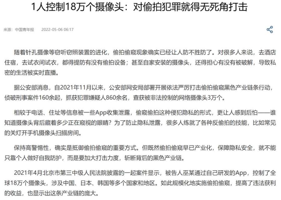 2021 年,同样由北京警方破获的案件中,犯罪分子通过自己开发的 App 控制了 18 万个摄像头,涉及中日韩等全球多个国家。