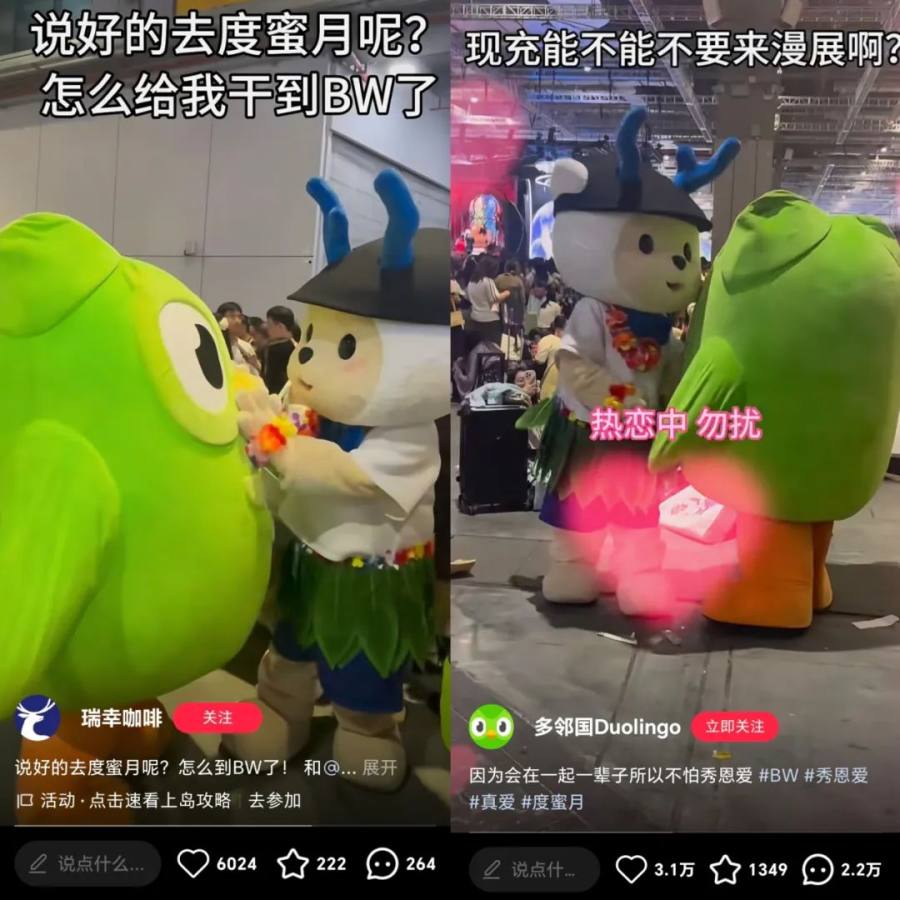 同样,还有虽然没有官方赞助,但仅靠一个玩偶便可以蹭到流量的瑞幸。BW期间,瑞幸以小鹿人偶造型和新晋的联名搭子多邻国小绿鸟一起亮相漫展现场,在公共区和各大展位“流窜式互动”,凭借强社交造梗能力,也收获了一波互联网声量。