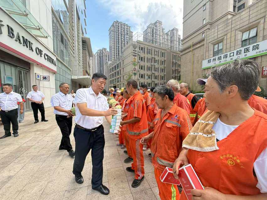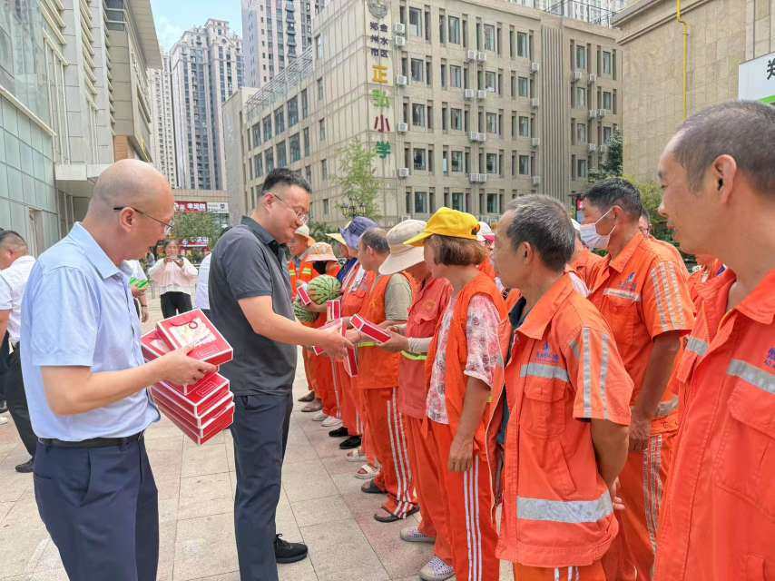 炎炎夏日,热浪袭人。持续的高温天气无疑为环卫工人的日常工作带来了极大的挑战。然而,正是这些默默无闻的环卫英雄,在烈日下坚守岗位,用他们的辛勤汗水守护着城市的整洁与文明。7月24下午,文化路办事处蓝堡湾社区党委与裕耀建筑党支部在世玺中心广场联合开展为环卫工人“夏送清凉”活动。