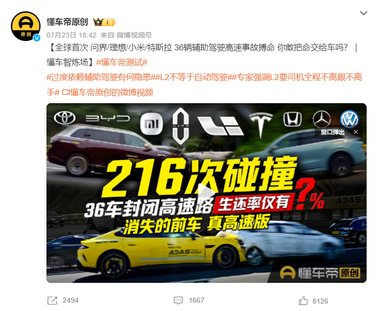 懂车帝重申,本节目仅代表事故模拟当时该车辆的碰撞结果,不代表其在所有辅助驾驶场景下的表现。“我们希望通过节目科普,告诉消费者辅助驾驶存在安全边界,自己才是生命的第一责任人。”