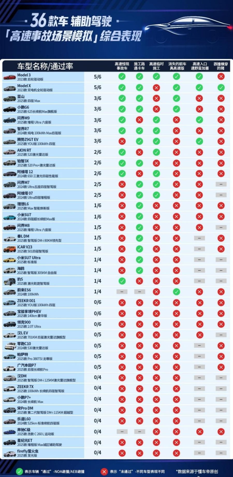 从高速事故场景模拟来看,共36款车型参与,累计完成183次测试,44次测试被评为“通过”,整体通过率24%。