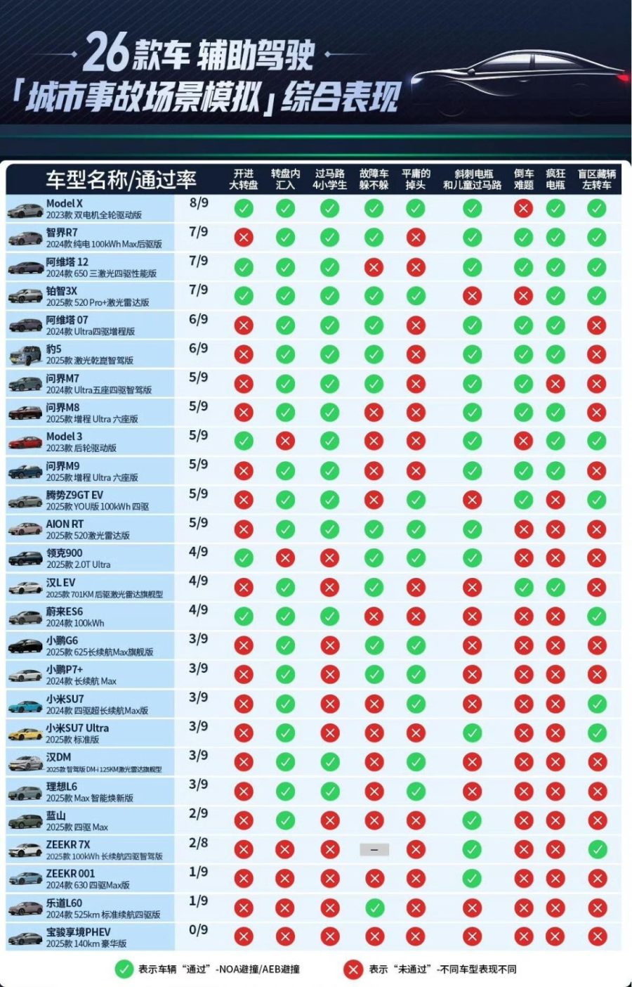 城市事故场景模拟里,26款车型参与测试,总测试次数233次,通过103次,通过率约44.2%。特斯拉Model X通过率最高,达到了8/9,在开进大转盘、转盘内汇入等多个项目上表现出色,是参测车型中通过率最高的。