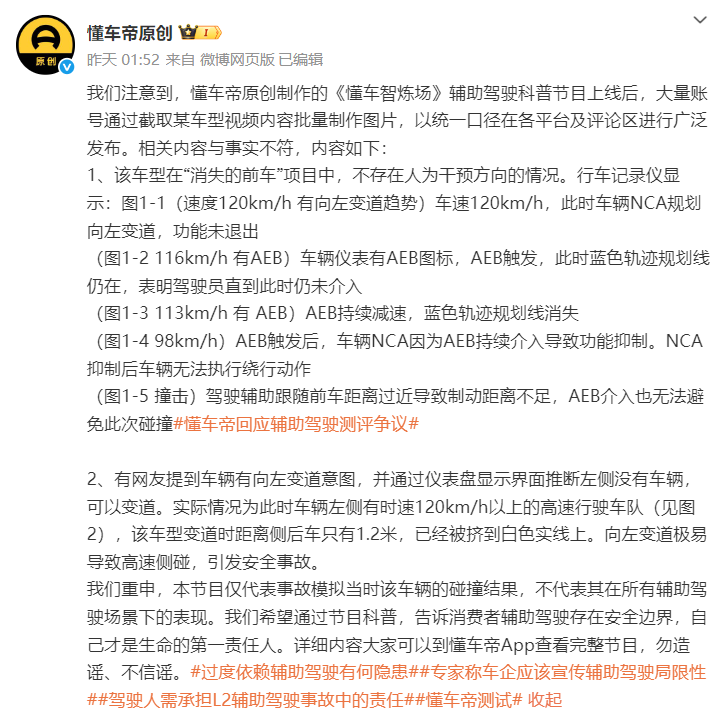 7月24日,懂车帝发文回应称,懂车帝原创制作的《懂车智炼场》辅助驾驶节目上线后,大量账号通过截取某车型视频内容批量制作图片,以统一口径在各平台及评论区进行广泛发布,相关内容与事实不符。