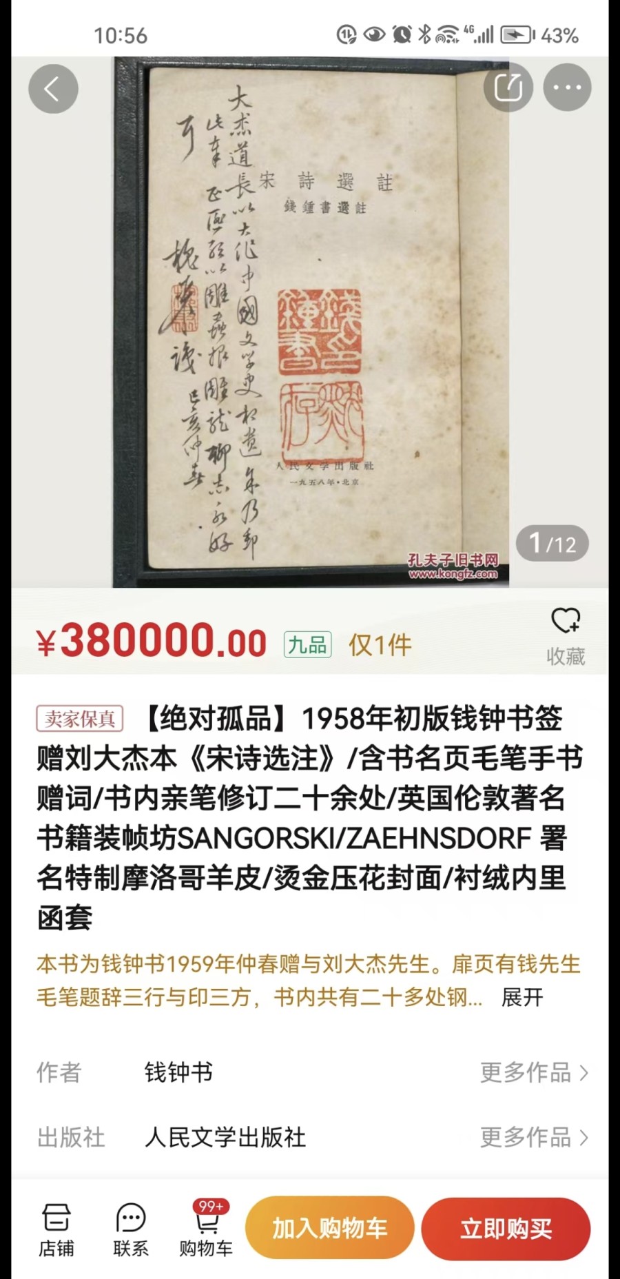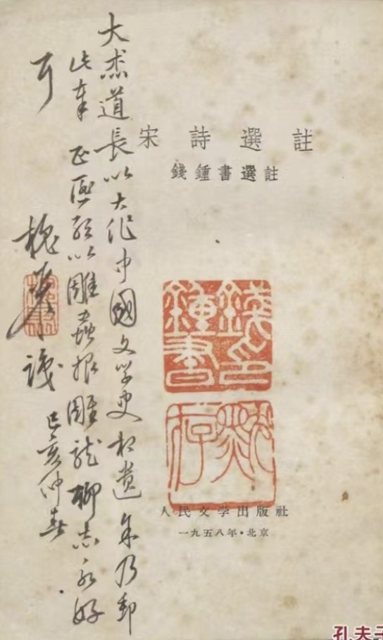 我在“孔夫子网”还见到一本号称“绝对孤品”的1958年初版《宋诗选注》,钱锺书赠刘大杰的签名本,扉页有钱氏毛笔题辞:“大杰道长以大作《中国文学史》相遗,余乃邮此奉正。匪敢以雕虫报雕龙,聊志永好耳。槐聚识。己亥仲春”,盖有三方印章分别为“槐聚”“钱锺书印”“默存”。更为“孤品”的是书内还有二十多处钢笔修改的地方。也正因为此,这本签名本价格也就高到有点“独孤求败”的境地,竟然喊到380000元,说不定已经超过这本初版书的总码洋了。