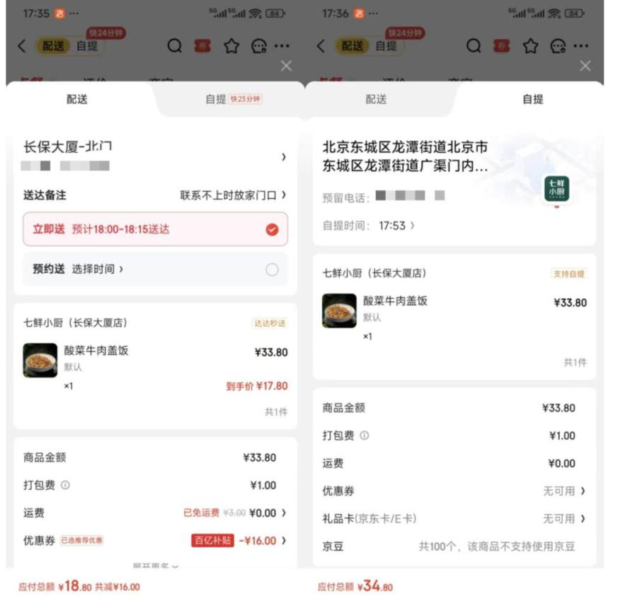 选择外卖配送仅需要支付1元打包费,在平台对外卖优惠券力度更大的补贴下,一份酸菜牛肉盖饭到手仅需要18.8元,若选择自提则需要按照原价支付。