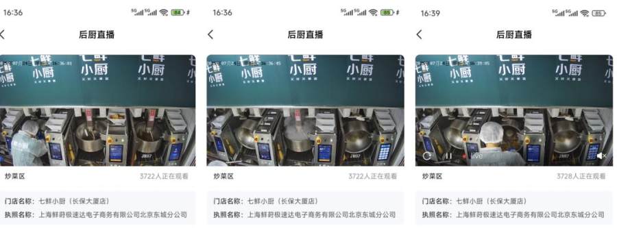 除了性价比优势外,七鲜小厨的另一大亮点还在于可以在平台上实时看到后厨炒菜的画面。剁椒Spicy在下午4点半左右打开后厨直播时观察到,依旧有近4000人同时在线观看,画面中有后厨人员将备好的配菜放在炒菜机一旁,在一旁的屏幕上摁下对应菜品后,炒菜机便开始热油、烹炒,一道菜的制作过程在3-5分钟,由后厨人员盛出装盘,接着炒菜机进入清洗模式,如此反复运营。