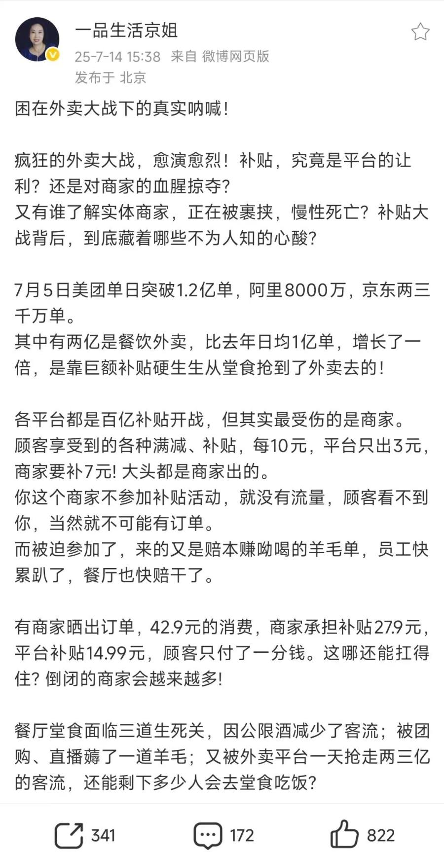“各平台都是百亿补贴开战,但其实最受伤的是商家。顾客享受到的各种满减、补贴,每10元,平台只出3元商家要补7元 !大头都是商家出的。”她在微博中表示,“餐厅堂食面临三道生死关,因公限酒减少了客流;被团购、直播薅了一道羊毛;又被外卖平台一天抢走两三亿的客流,还能剩下多少人会去堂食吃饭?”