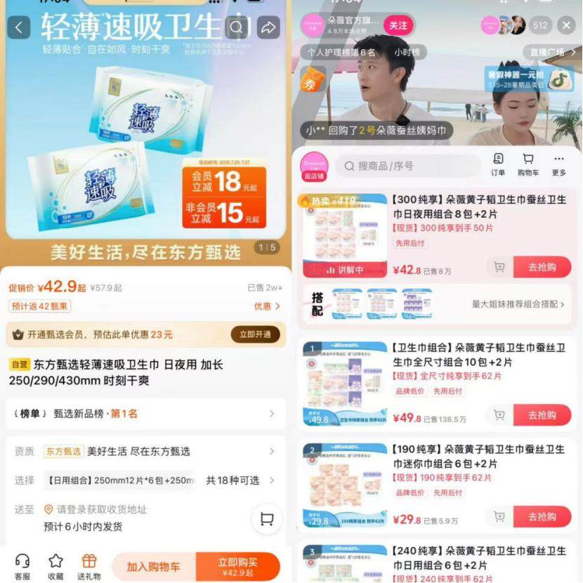 对于俞敏洪来说,他能够利用自身的流量优势,省去高昂的营销和流通费用。目前,东方甄选卫生巾不仅在自有APP平台销售,也在东方甄选的多个直播间进行销售。