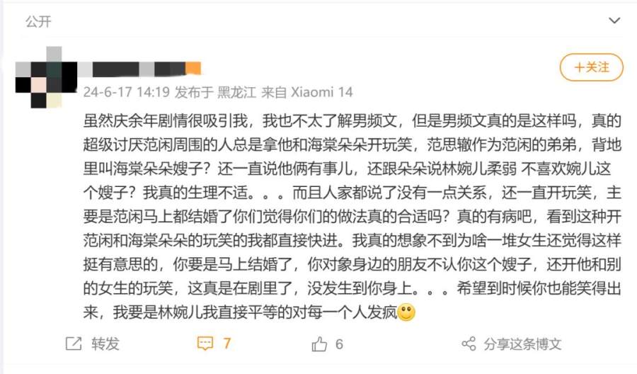 《庆余年》原著里,范闲总共有两名妻妾和三个红颜知己,说是在开后宫也不过分。王倦撰写剧本的时候,砍掉了范闲除林婉儿外的所有感情支线,不断强化“范婉”这对CP。范闲与海棠朵朵的各种互动,直接引来了CP粉丝的不满。