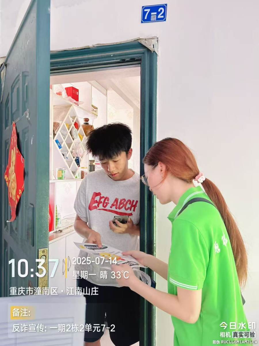 夏季是诈骗案件高发、青少年溺水事故易发期,为切实筑牢基层安全防线,7月14至15日,重庆电力高等专科学校“青马领航”习近平新时代中国特色社会主义思想宣传团与潼南区梓潼街道大桥社区党委、网格员联合行动,以“践行新时代枫桥经验”为指引,精准施策开展防诈骗、防溺水安全宣传,开展地毯式敲门入户行动,将安全知识送到群众身边,用青春力量守护社区平安。