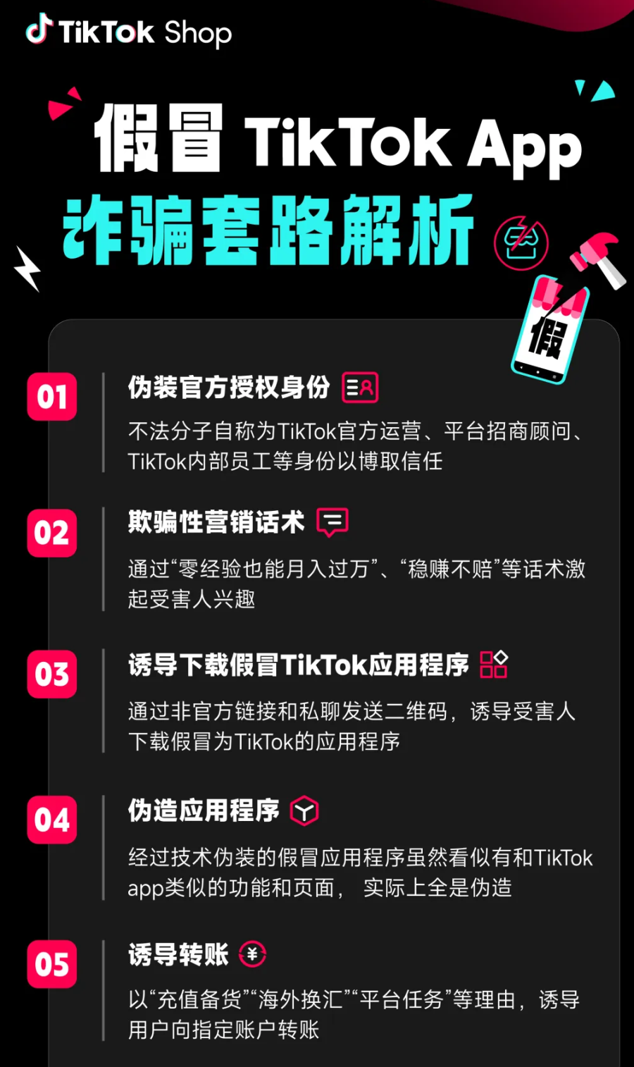 近日,TikTok Shop发布反诈警示,揭露不法分子伪造高仿真TikTok相关App实施诈骗的行为,包括诱导商家和用户下载假冒app等行为。