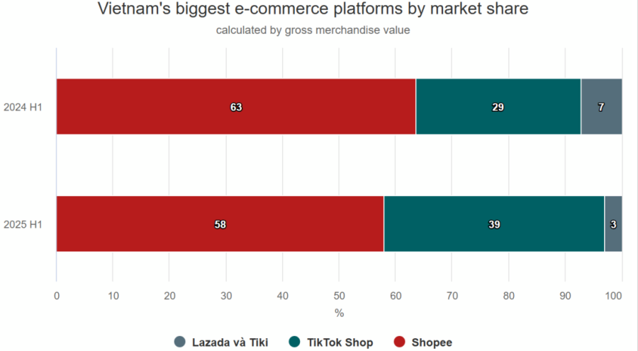 TikTok Shop和Shopee合计拥有 97% 的市场份额,而Lazada和Tiki则占据了剩余的 3%。