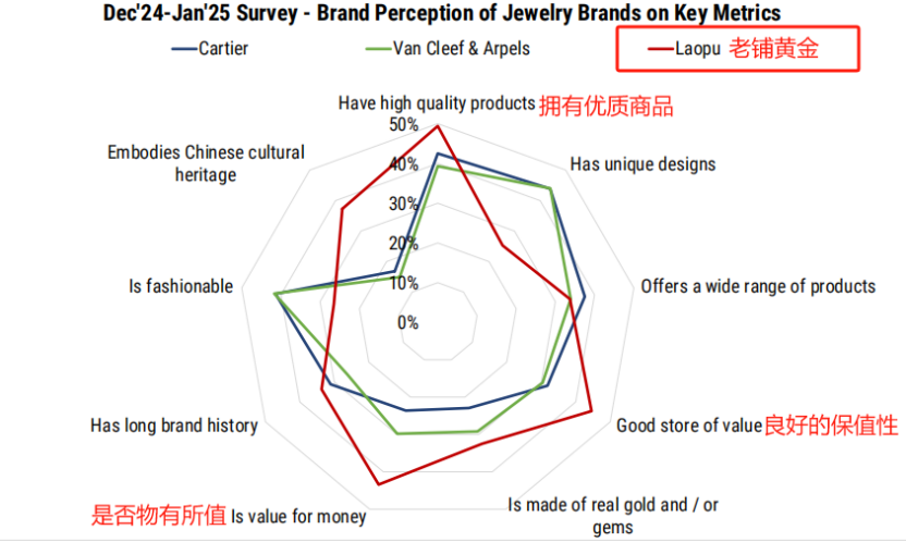黄金也不再是一种具有保值属性的金属,而是成功升维为承载中国文化的珍贵载体,展现出经典、传世且极具中式高级审美的品牌调性。消费者乐于在日常中佩戴,而非闲置于保险柜中,分享自己的品质追求和审美品味。大摩研报指出2025年老铺黄金在社交媒体的搜索量加速增长,在社交媒体上,晒“佩戴老铺黄金”已经成为一种时尚和社交话题的流量密码。