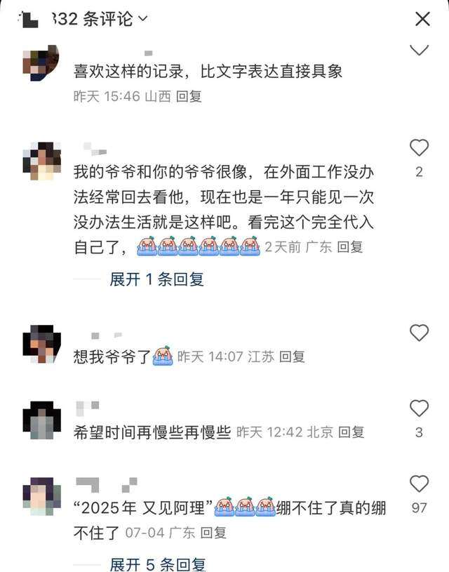 “看完这个完全代入自己了,真的真的好想我爷爷”、“没有很煽情,但为什么这么想哭呢”、“我就是长江边长大的,看到好多就像看到自己家一样”......或分享个人故事、或表达看完的感受,小红书站内很多网友纷纷在作品评论区留言。