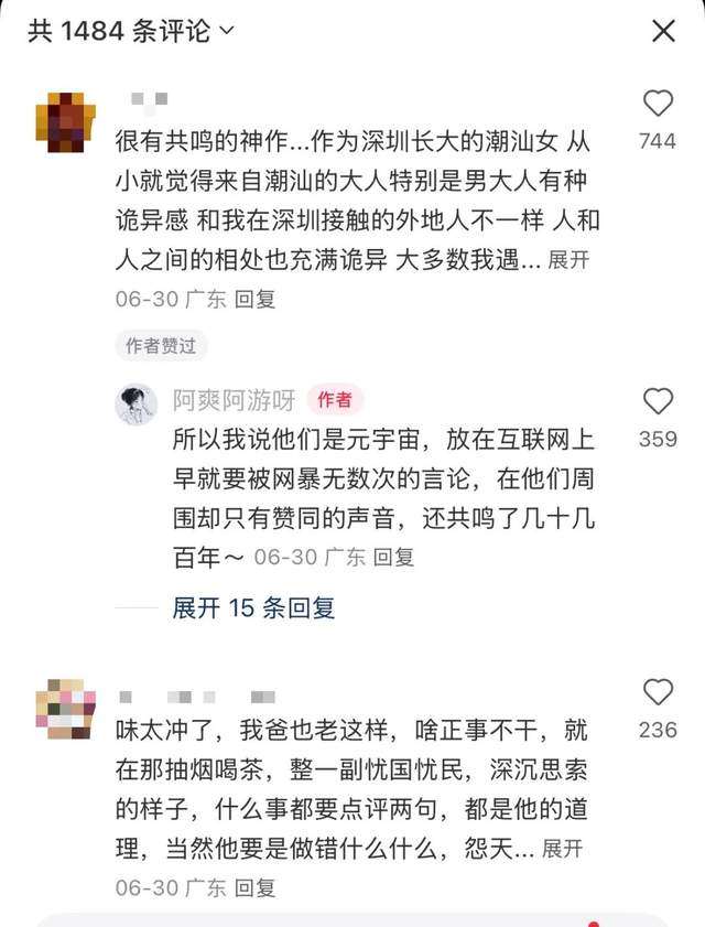 这种真实生活的浓缩,引起了很多拥有类似家庭背景的人的共鸣。“味太冲了,我爸也这样,啥正事不干但很喜欢点评时事”、“很有共鸣的神作,从小就觉得来自潮汕的大人特别是男大人有种诡异感”、“和我爸感觉很像,西北快60的大叔”,网友纷纷评论。