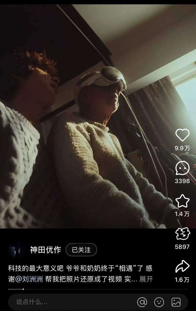 《再见阿理》的灵感就源自小红书其他用户的笔记,“去年春节,我刷到一位用户给病床上的爷爷戴上了vision pro,当时我就被打动了”,被启发后@神田优作请@刘洲洲帮忙复原了奶奶唯一的照片,记录下爷爷通过vision pro与奶奶的“相遇”,该条短片目前有近10万的点赞。
