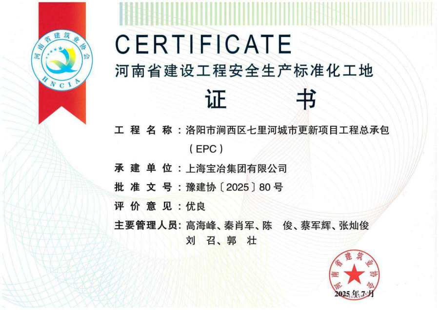 此次获评省级安全生产标准化工地,是对七里河项目部安全生产管理成效的认可。项目部将持续强化安全管理,提升工程品质,确保项目如期交付,为洛阳市建强副中心、形成增长极贡献“宝冶力量”。