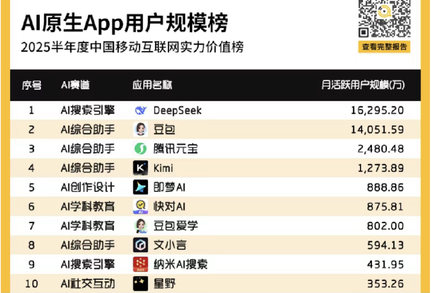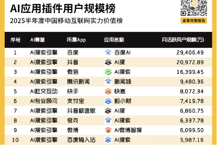AI原生App用户规模D豆包元宝前三,百度文小言594万月活用第八,但百度应用插件用户规模第一