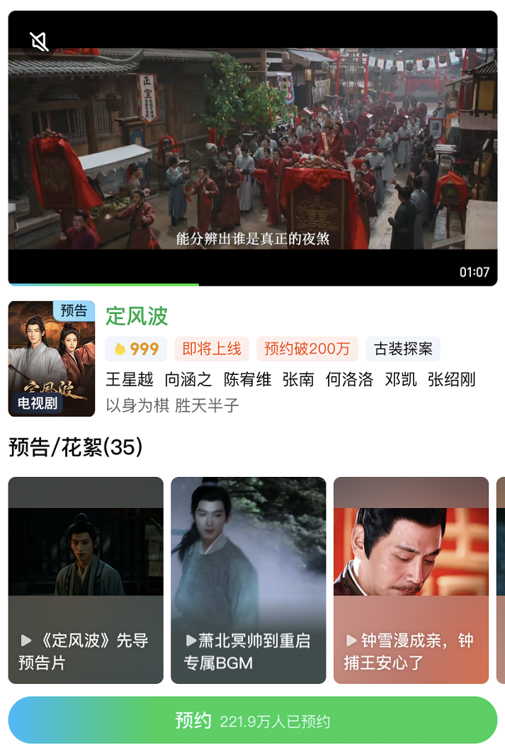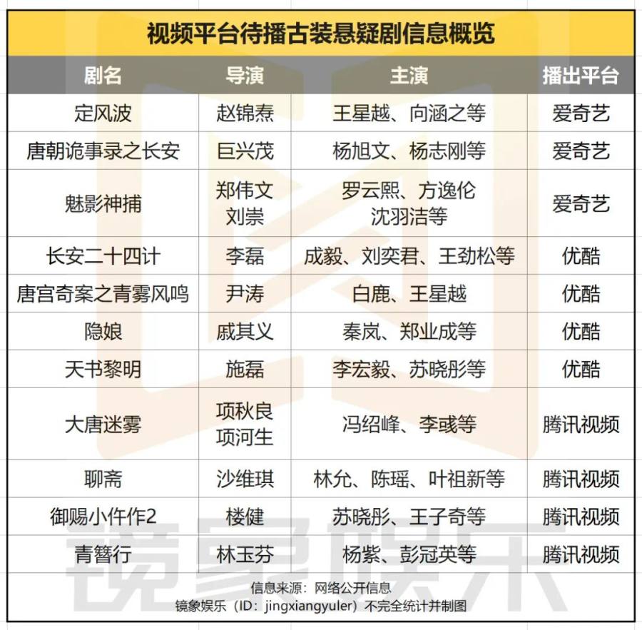 而在各大平台的待播内容中,古装悬疑剧也是各家储备的热门题材。据镜象娱乐不完全统计,截至目前,仅优爱腾三家待播的古装选悬疑剧就有十多部。其中,除了已经定档的《定风波》之外,优酷的《唐宫奇案之青雾风鸣》也已进入密集宣发期,站内预约破百万,腾讯视频的《御赐小仵作》第二季,也于7月29日拿到发行许可,预计不久将与观众见面。