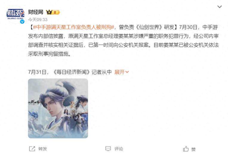 据媒体报道,7月30日,中手游发布内部信,原满天星工作室总经理姜某某涉嫌严重的职务犯罪行为,经公司内审部调查并核实相关证据后,已第一时间向公安机关报案。目前姜某某已被公安机关依法采取刑事拘留措施。