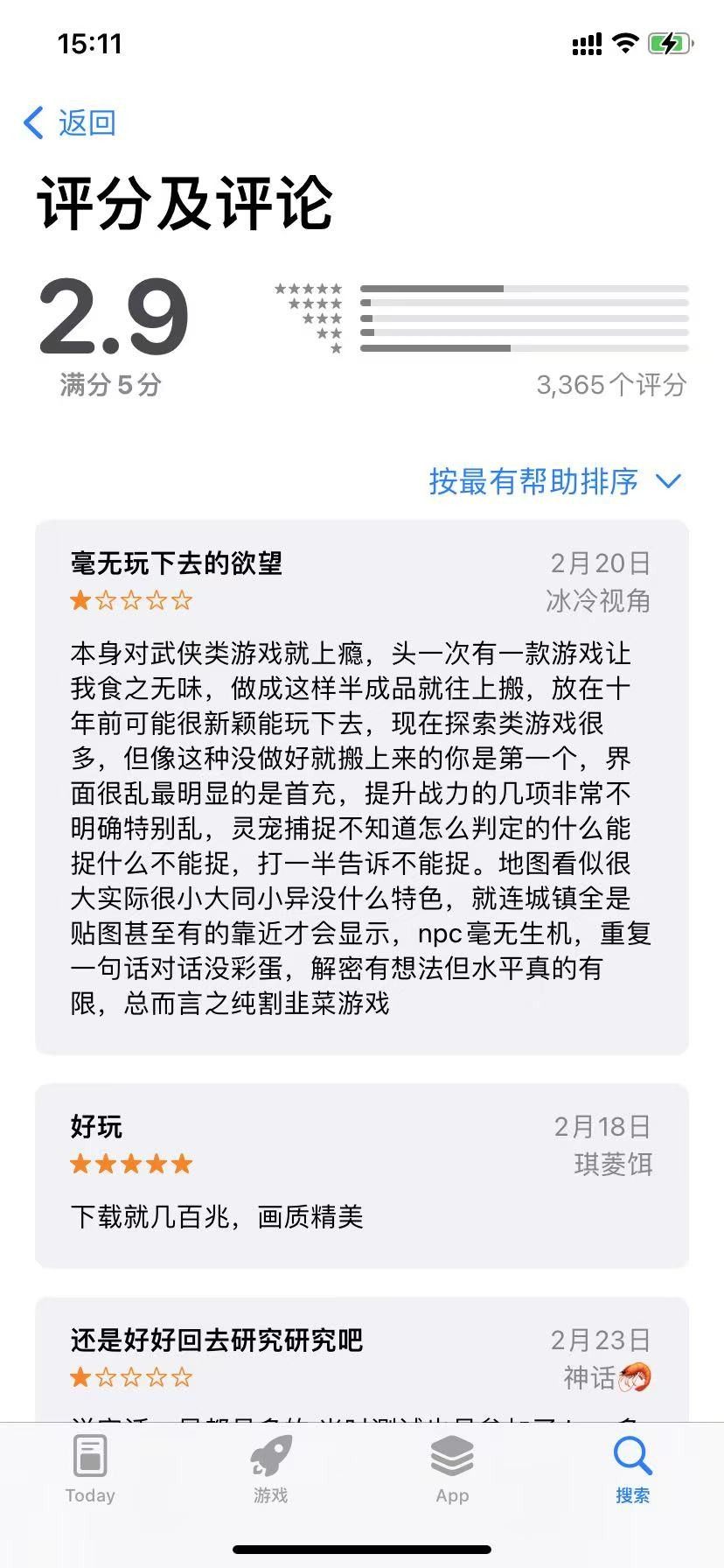 《仙侠世界》表现不佳,与游戏体验较差有很大关系。“趣解商业”注意到,截至8月1日,《仙侠世界》在App Store的评分为2.9分(满分5分)。该游戏的评分较为极端,五星和一星评价最多,数量相差无几。多位网友给出一星评价的理由是,“NPC毫无生机,解密有想法但水平真的有限,总而言之纯割韭菜游戏”;“过场动画又臭又长”;“界面花里胡哨,功能又多又乱,剧情拉胯,完全不像仙剑”……
