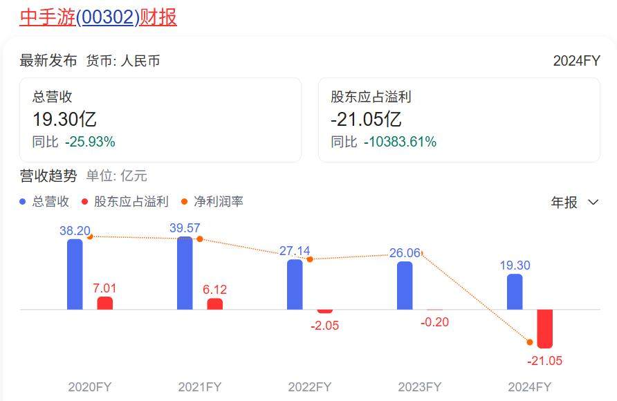 《仙侠世界》的市场表现不尽如人意,也拖累了中手游的业绩。财报显示,2024年,中手游总营收同比下滑25.93%至19.3亿元;股东应占溢利为-21.05亿元,同比减少10383.61%,为近五年最低。