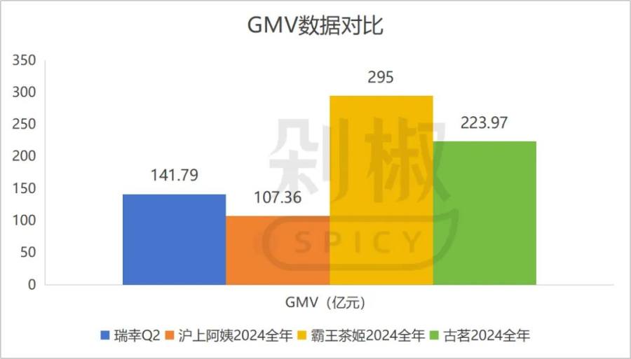 即便放到更广泛的饮品市场,瑞幸的规模优势也十分明显,单季141.79亿元的GMV已经超过沪上阿姨2024年全年107.36亿元的GMV规模,相当于霸王茶姬2024年295亿元GMV的近一半、古茗2024年223.97亿元GMV的63%。